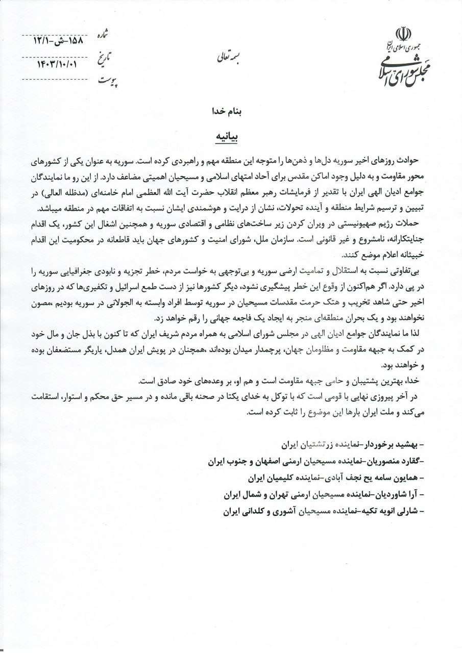 حوادث روزهای اخیر سوریه دلها و ذهنها را متوجه این منطقه مهم و راهبردی کرده است سوریه به عنوان یکی از کشورهای محور مقاومت و به دلیل وجود اماکن مقدس برای آحاد امتهای اسلامی و مسیحیان اهمیتی مضاعف دارد. از این رو ما نمایندگان جوامع ادیان الهی ایران با تقدیر از فرمایشات رهبر معظم انقلاب حضرت آیت الله العظمی امام خامنه ای (مدظله العالی) در تبیین و ترسیم شرایط منطقه و آینده تحولات نشان از درایت و هوشمندی ایشان نسبت به اتفاقات مهم در منطقه میباشد. حملات رژیم صهیونیستی در ویران کردن زیر ساختهای نظامی و اقتصادی سوریه و همچنین اشغال این کشور یک اقدام جنایتکارانه نامشروع و غیر قانونی است سازمان ملل شورای امنیت و کشورهای جهان باید قاطعانه در محکومیت این اقدام خبیثانه اعلام موضع کنند