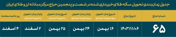 جلسه حراج در ساعت ۱۲ روز شنبه ۶ بهمن آغاز میشود و نتایج آن در ساعت ۱۶ همان روز اعلام خواهد شد. وجوه باقیمانده در کیف پول کاربران تا ۴۸ ساعت پس از حراج به حساب بانکی آنها بازگردانده میشود. هزینههای تحویل و انبارداری سکهها نیز بهطور جداگانه محاسبه و دریافت میشود. تحویل سکهها از ۱۶ بهمن آغاز شده و در صورت عدم مراجعه به موقع، معامله فسخ و خریدار از شرکت در حراجهای بعدی محروم میشود./ پایان پیام