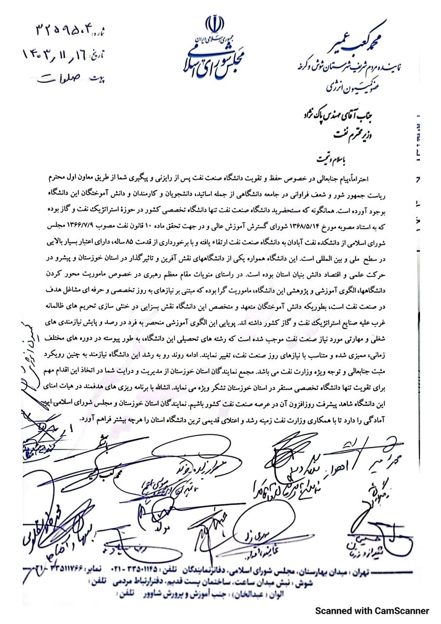 در پایان این نامه تأکید شده که امیدواریم با برنامهریزیهای هدفمند در هیئت امنای این دانشگاه، شاهد پیشرفت روزافزون آن در عرصه صنعت نفت کشور باشیم. نمایندگان استان خوزستان و مجلس شورای اسلامی آمادگی را دارد تا با همکاری وزارت نفت زمینه رشد و اعتلای قدیمیترین دانشگاه استان را هرچه بیشتر فراهم آورد./ پایان پیام