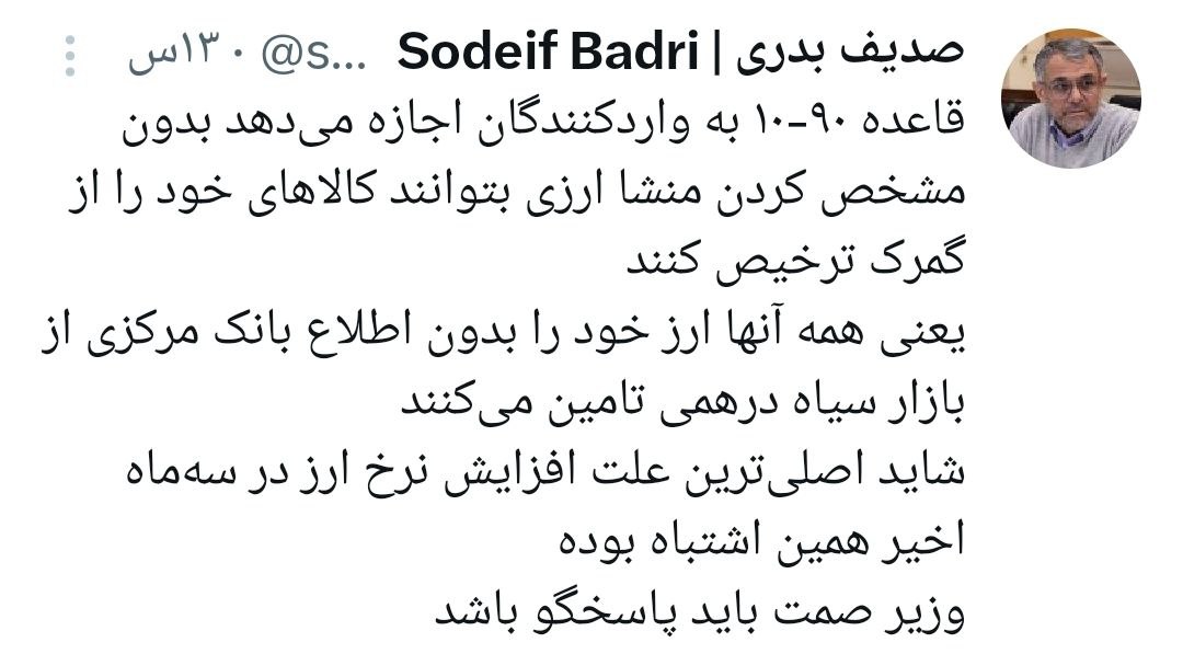 صدیف بدری نماینده مردم اردبیل، سرعین، نمین و نیر مجلس شورای اسلامی در شبکه اجتماعی ایکس نسبت به عملکرد وزارت صمت در خصوص نوسانات قیمت دلار نوشت: