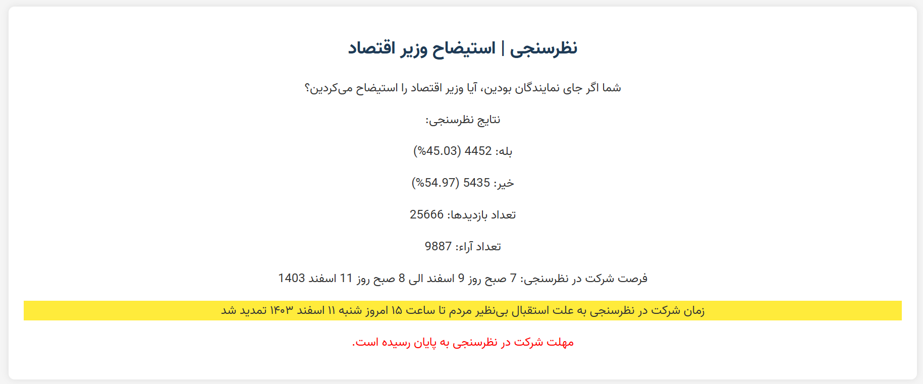 نتایج این نظرسنجی نشان داد که ۵۴.۹۷ درصد از شرکتکنندگان (۵۴۳۵ نفر) با استیضاح وزیر اقتصاد مخالفت کردهاند، در حالی که ۴۵.۰۳ درصد (۴۴۵۲ نفر) موافق استیضاح بودند. این نظرسنجی همچنین بیش از ۲۵۶۶۶ بازدید داشت که نشاندهنده توجه بالای مخاطبان به این موضوع است.