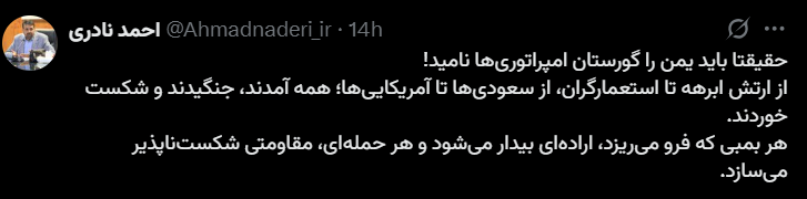احمد نادری، عضو هیئت رئیسه مجلس شورای اسلامی، در واکنش به حملات اخیر آمریکا به یمن، در حساب کاربری خود در شبکه اجتماعی ایکس نوشت که یمن را باید “گورستان امپراتوریها” نامید. او با اشاره به تاریخ این کشور، از ارتش ابرهه تا استعمارگران، سعودیها و اکنون آمریکاییها را قدرتهایی دانست که در برابر یمن به زانو درآمدهاند.