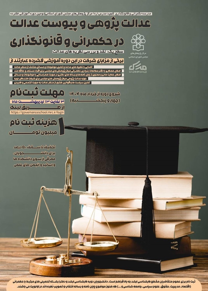 مدرسه حکمرانی و قانونگذاری شهید مدرس(ره) و با همکاری دفتر مطالعات بنیادین حکمرانی مرکز پژوهشهای مجلس شورای اسلامی، دومین دوره آموزشی و پژوهشی با عنوان «عدالت در حکمرانی و قانونگذاری» (سطح یک: نقد و بررسی نظریههای عدالت) ویژه تربیت و آموزش متخصصان حوزه عدالت و تکمیل نیروهای پژوهشی برگزار میشود.