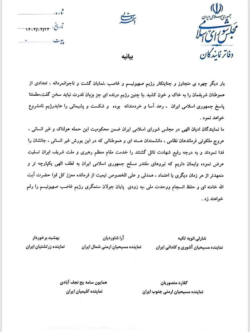 ما نمایندگان ادیان الهی در مجلس شورای اسلامی ایران ضمن محکومیت این حمله هولناک و غیر انسانی ، عروج ملکوتی فرماندهان نظامی، دانشمندان هسته ای و هموطنانی که در این یورش غیر انسانی ، جانشان را فدا نمودند و به درجه رفیع شهادت نائل گشتند را خدمت مقام معظم رهبری و ملت شریف ایران تسلیت عرض نموده و ایمان داریم که نیروهای مقتدر مسلح جمهوری اسلامی ایران به لطف الهی یکپارچه‌تر و متعهدتر از هر زمان دیگری با اعتماد ، همدلی و علی الخصوص تبعیت از فرمانده معزز کل قوا حضرت آیت الله خامنه‌ای و حفظ انسجام و وحدت ملی به زودی پایان جولان ستمگری رژیم غاصب صهیونیسم را رقم خواهند زد.