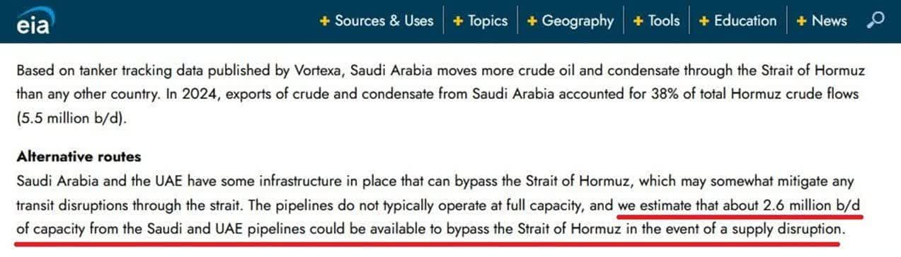 طبق برآورد eia، در صورت بستن تنگه هرمز، امارات و عربستان تنها میتوانند ۲.۶ میلیون بشکه از نفت صادراتی خود را از خطوط لوله به خارج از تنگه منتقل کنند.