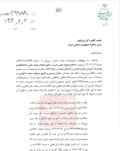 رئیس مجلس شورای اسلامی در نامه ای به رئیس جمهور، ایراداتی نسبت به مصوبه هیات وزیران درخصوص «اصلاح مصوبه تعیین ضریب حقوق اعضای هیئت علمی دانشگاه‌ها و مؤسسات آموزش عالی و قضات و کارکنان دولت در سال 1404» مطرح کرد و آن را مغایر با قانون دانست.