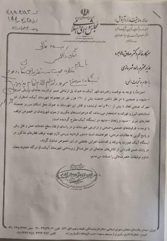 به گزارش خبرنگار صبح مجلس، سالار ولایتمدار با تشریح نتایج جلسه خود با وزیر راه و شهرسازی گفت: در این نشست، دو مطالبه اصلی مردم آبیک شامل توقف قطار در ایستگاه آبیک و ایجاد دسترسی ایمن از آزادراه تهران–قزوین به شهر آبیک مطرح شد که مورد تأیید وزیر قرار گرفت.