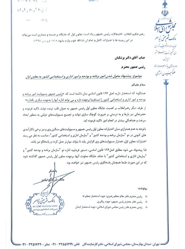نماینده مردم تهران، ری، شمیرانات، اسلامشهر و پردیس، در توئیتی به دکتر مسعود پزشکیان پیشنهاد داد تا اداره دو سازمان «برنامه و بودجه» و «اداری و استخدامی کشور» به معاون اول رئیس‌جمهور سپرده شود.