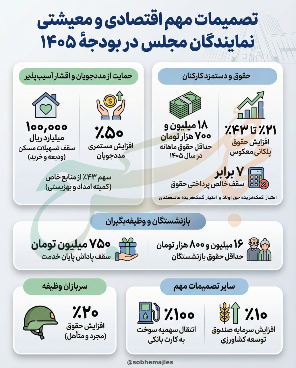 نمایندگان مجلس در بررسی لایحه بودجه ۱۴۰۵، جزئیات افزایش حقوقها، سقف وام مسکن مددجویان، حداقل دریافتی کارمندان و بازنشستگان و برخی مزایا را تعیین کردند.