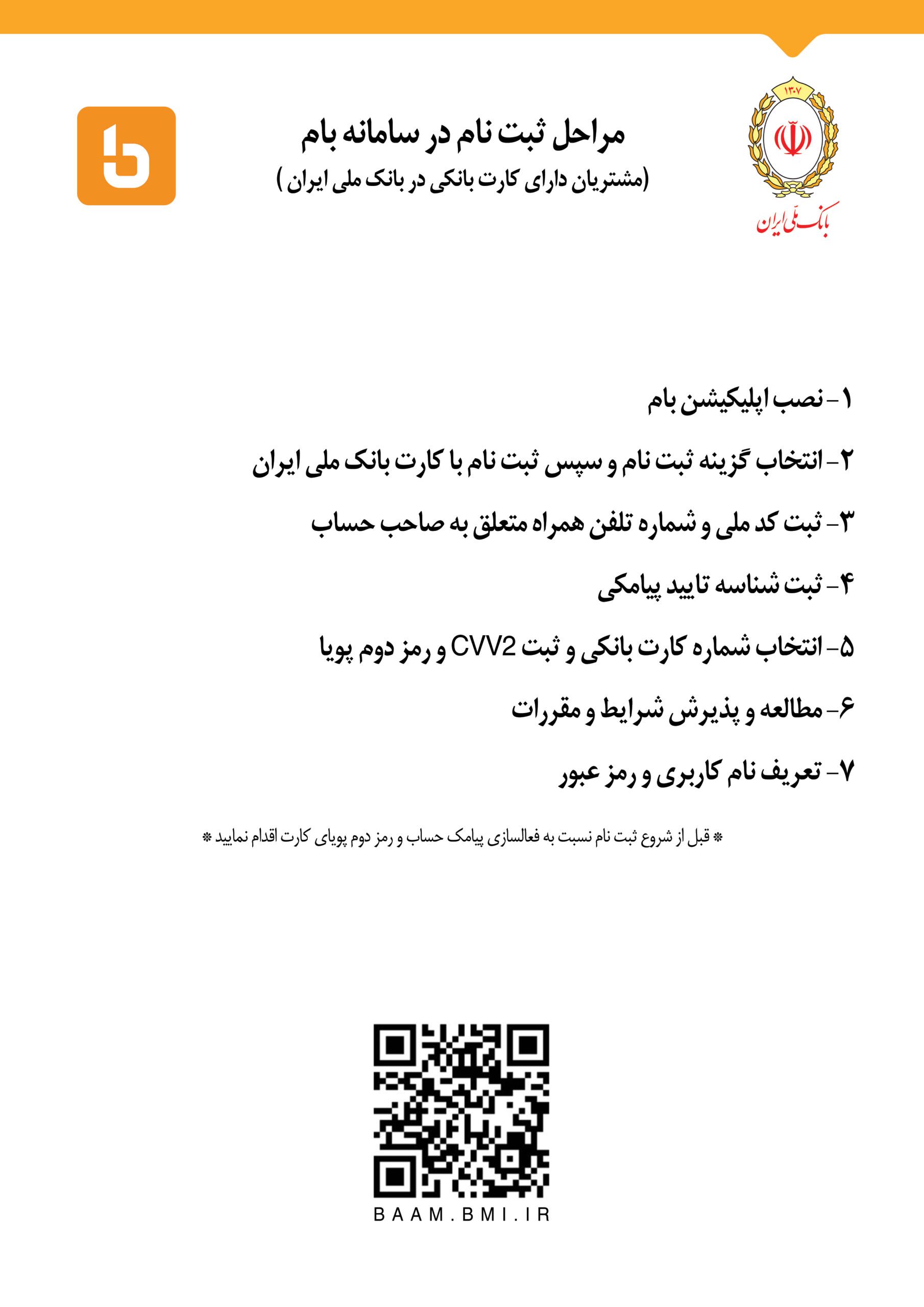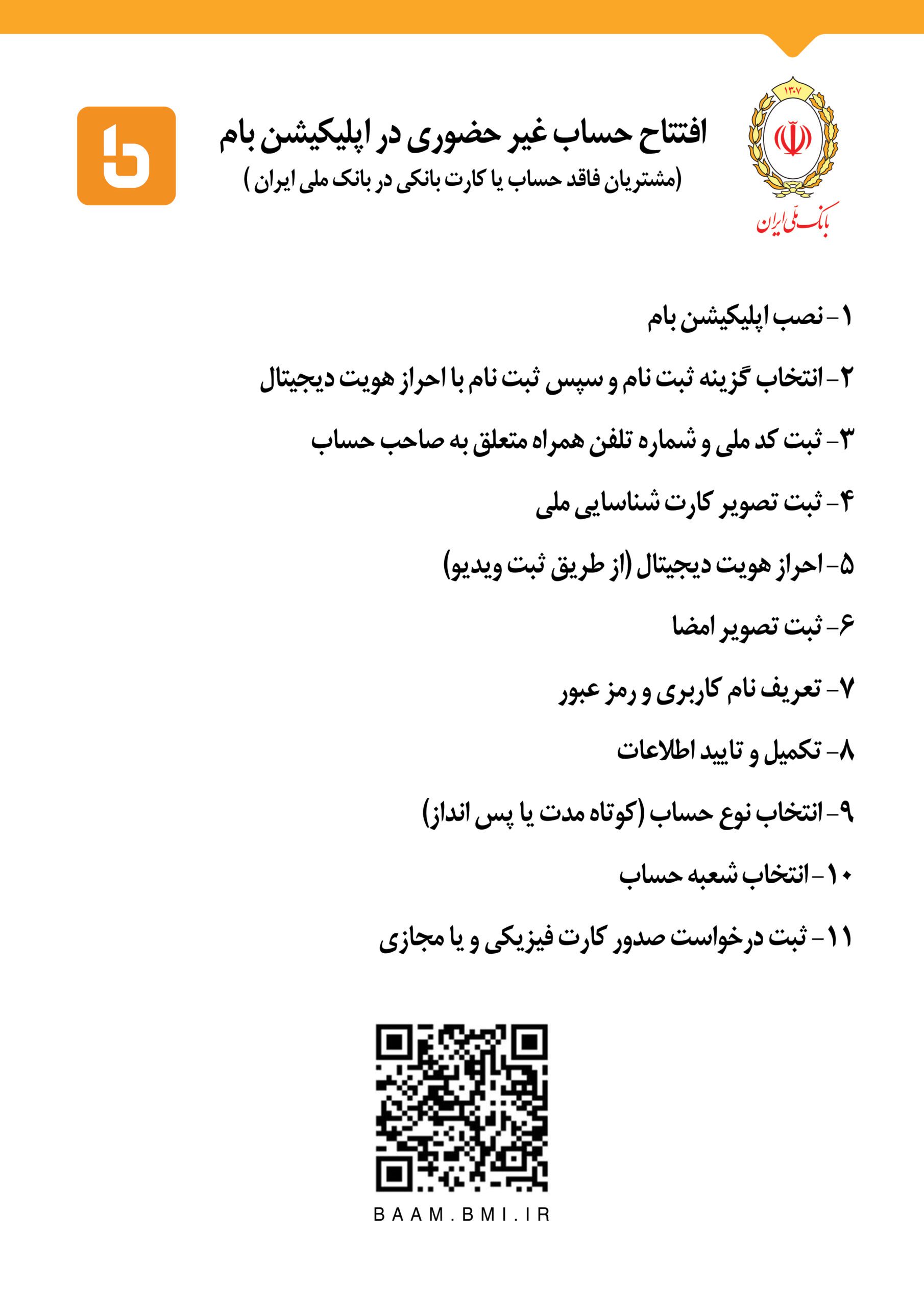 به گزارش روابط عمومی بانک ملی ایران، اگر در بانک ملی ایران حساب ندارید، می توانید با ثبت نام در سامانه بام ضمن افتتاح حساب، درخواست خود برای فعالسازی پیامک و صدور کارت را ثبت کنید.
