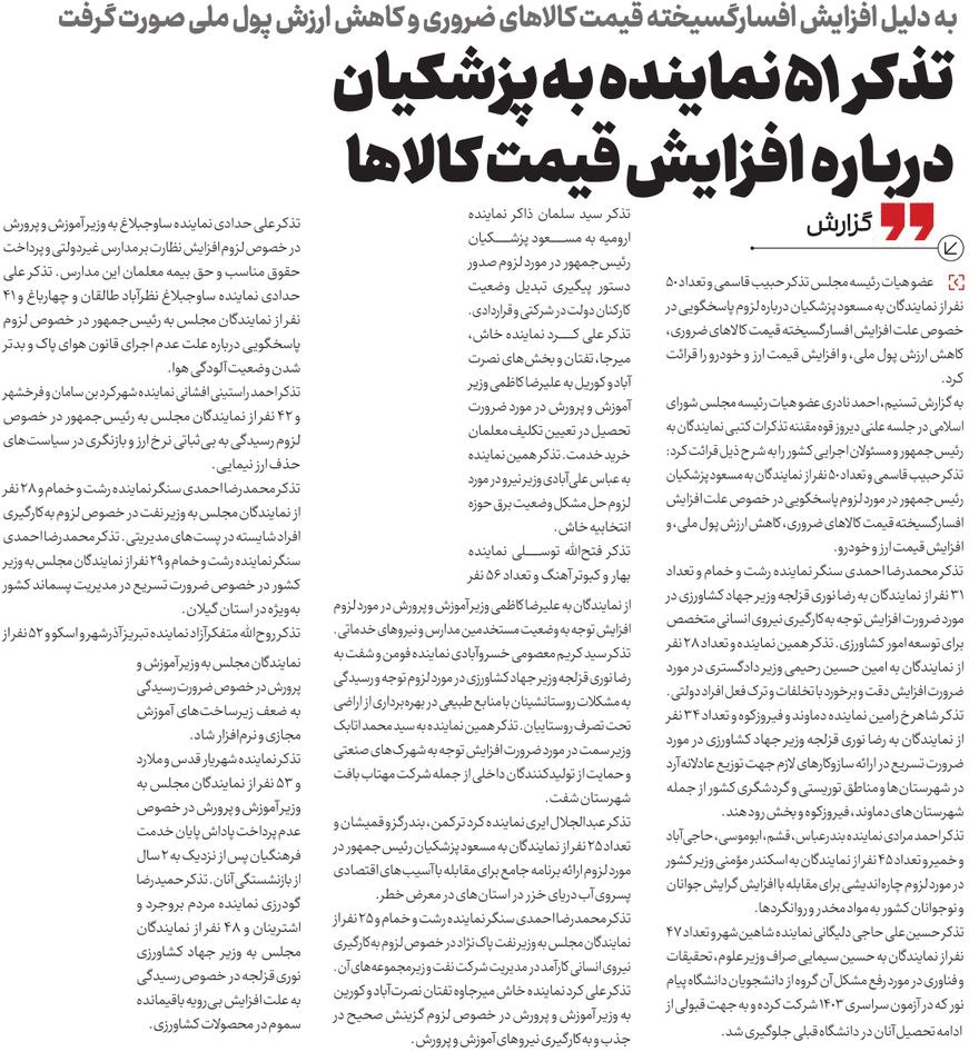 روزنامهٔ چارسوق: تذکر ۵۱ نماینده به پزشکیان درباره افزایش قیمت کالاها
