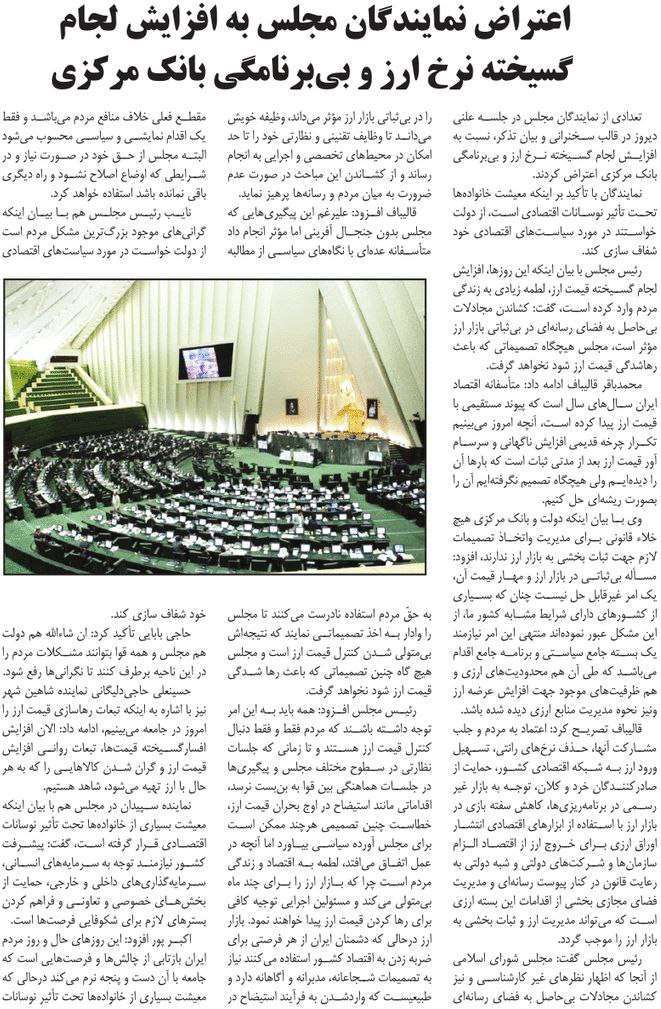 روزنامهٔ جمهوری اسلامی: اعتراض نمایندگان مجلس به افزایش لجام گسیخته نرخ ارز و بیبرنامگی بانک مرکزی