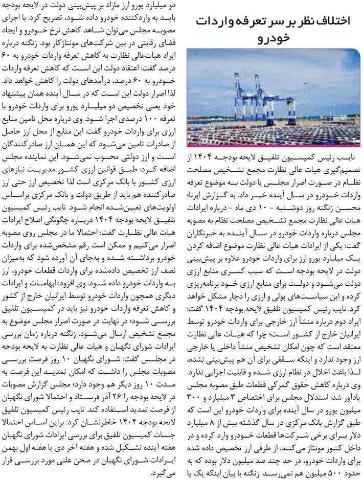روزنامهٔ گسترش صنعت: اختلافنظر بر سر تعرفه واردات خودرو
