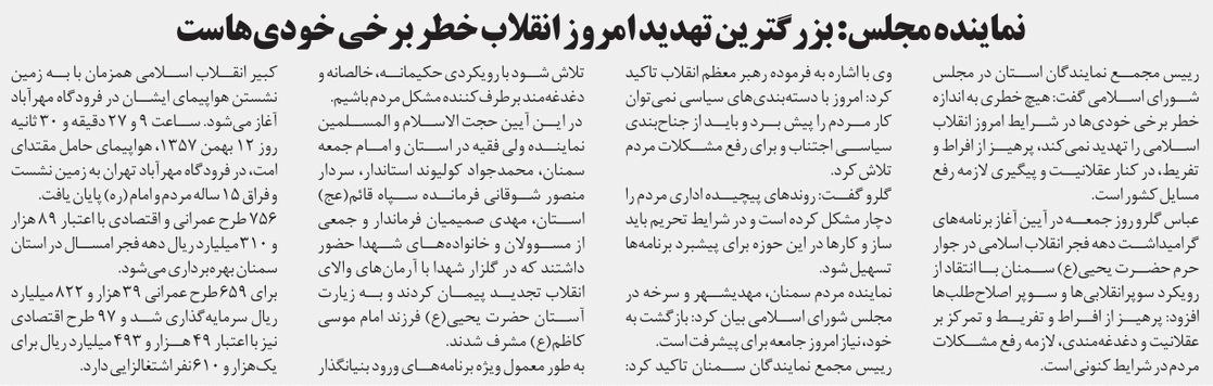روزنامهٔ افکار: نماینده مجلس: بزرگترین تهدید امروز انقلاب خطر برخی خودیهاست
