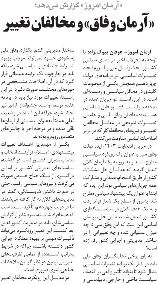 روزنامهٔ آرمان امروز: «آرمان وفاق» و مخالفان تغییر