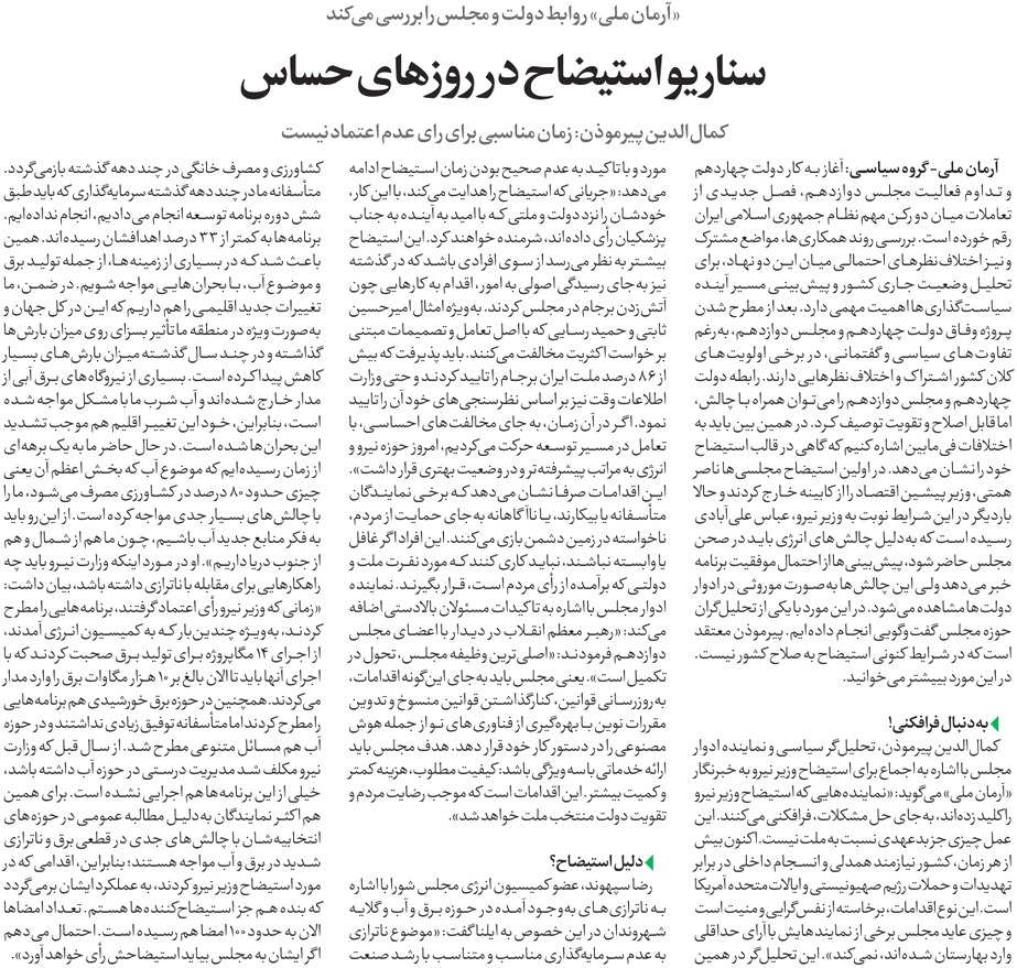 روزنامهٔ آرمان ملی: سناریو استیضاح در روزهای حساس