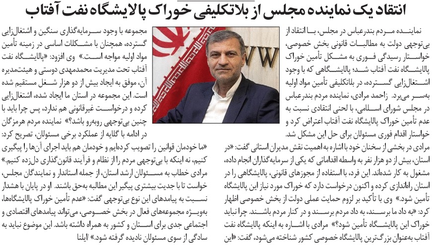 روزنامهٔ آرمان امروز: انتقاد یک نماینده مجلس از بلاتکلیفی خوراک پالایشگاه نفت آفتاب