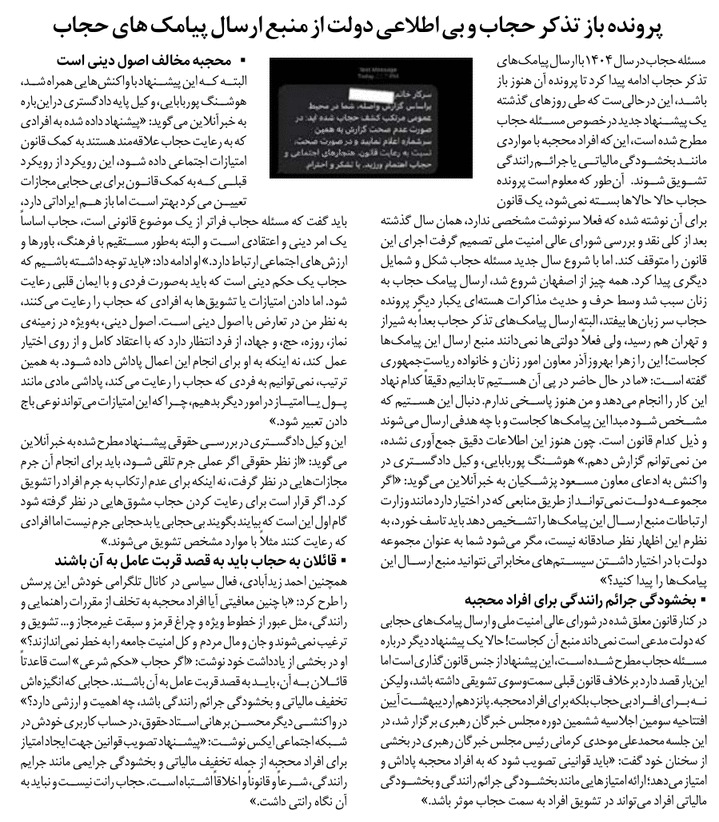 روزنامهٔ تجارت: پرونده باز تذکر حجاب و بیاطلاعی دولت از منبع ارسال پیامکهای حجاب