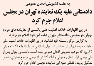روزنامهٔ کیهان: دادستانی علیه یک نماینده تهران در مجلس اعلام جرم کرد