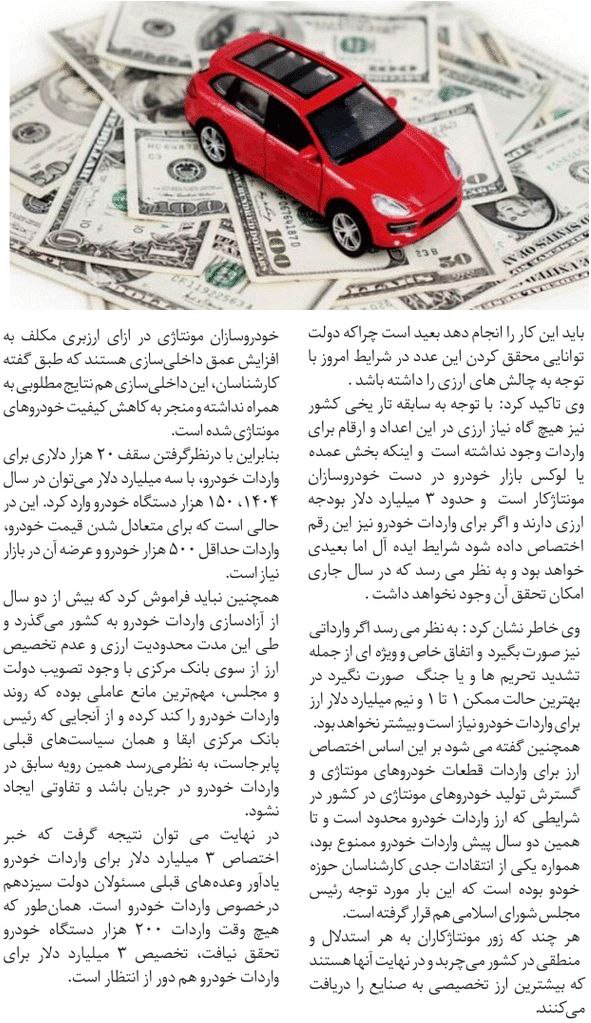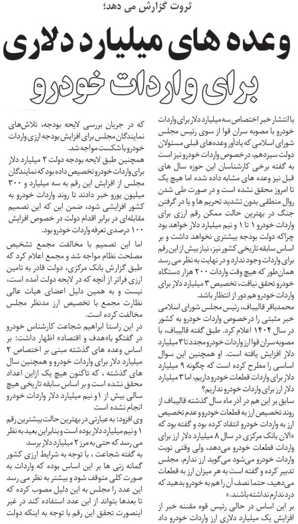 روزنامهٔ ثروت: وعدههای میلیارد دلاری برای واردات خودرو
