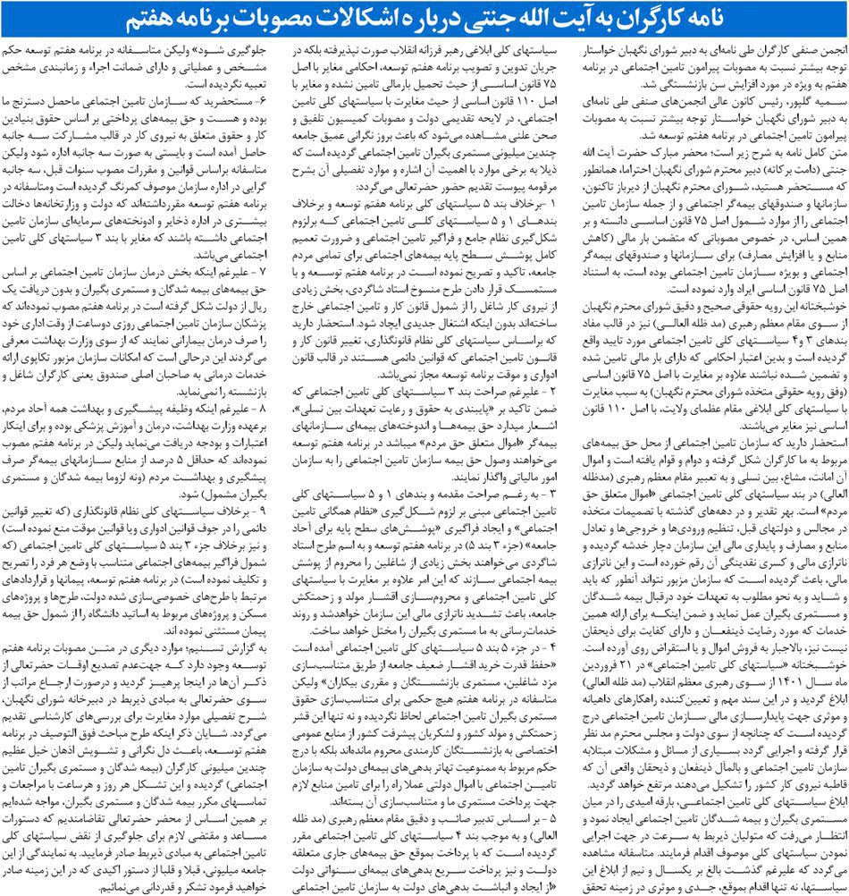 روزنامهٔ آفتاب یزد: نامه کارگران به آیتالله جنتی درباره اشکالات مصوبات برنامه هفتم