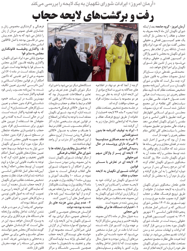 روزنامهٔ آرمان امروز: رفت و برگشتهای لایحه حجاب