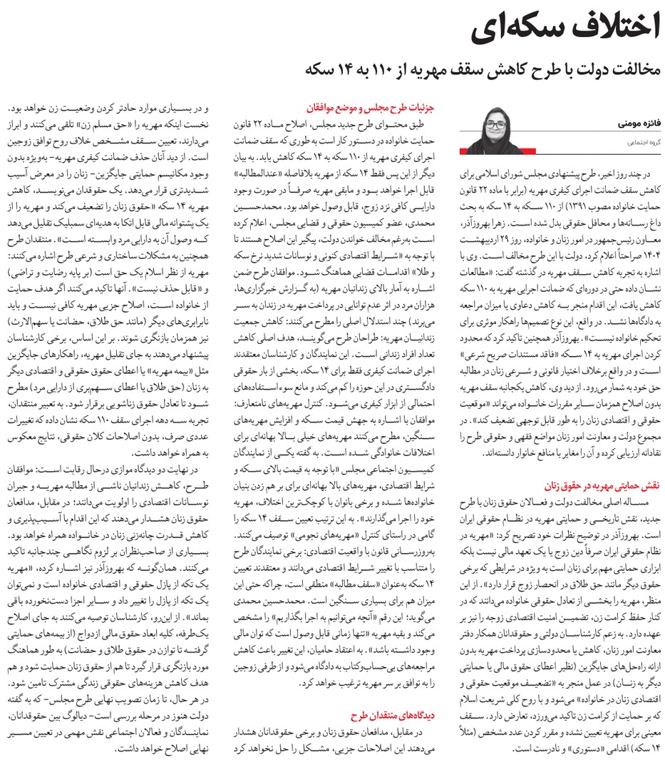روزنامهٔ شهروند: دوئل دولت و مجلس بر سر مهریه