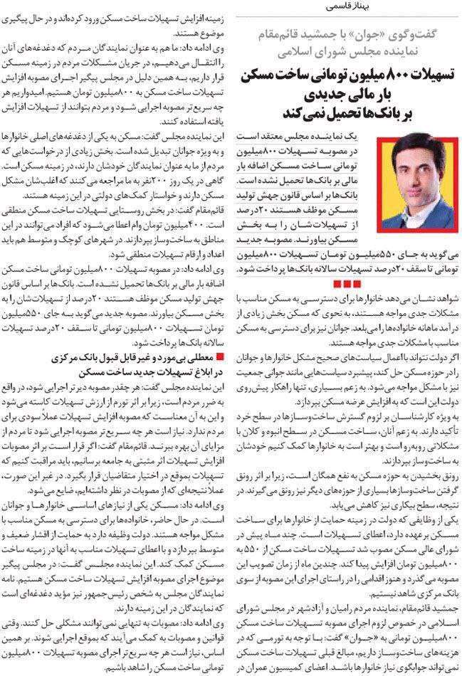 روزنامهٔ جوان: تسهیلات ۸۰۰ میلیون تومانی ساخت مسکن بار مالی جدیدی بر بانکها تحمیل نمیکند