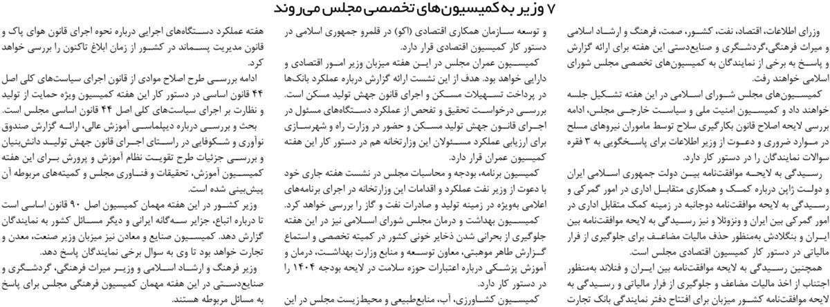 روزنامهٔ گسترش صمت: ۷ وزیر به‌کمیسیون‌های تخصصی مجلس می‌روند