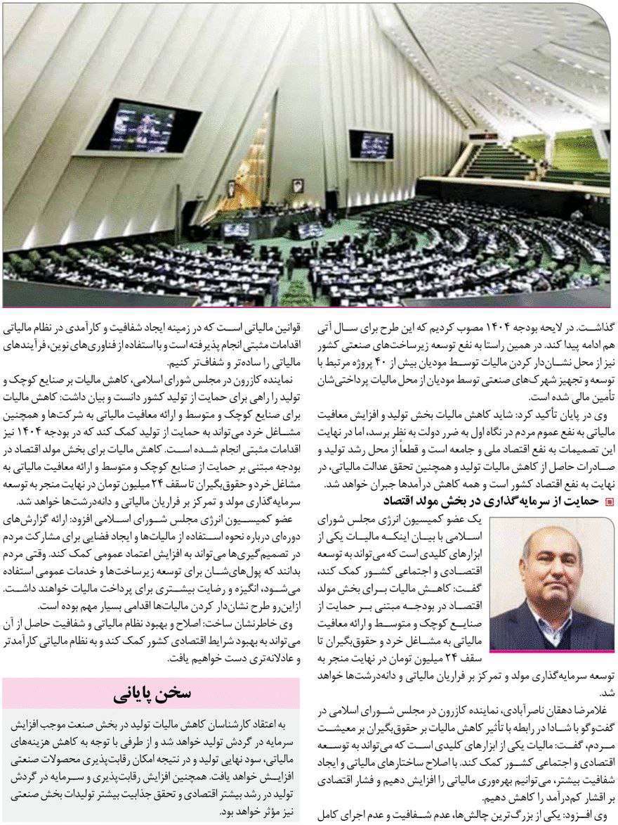 روزنامهٔ گسترش صمت: حمایت مجلس از کاهش مالیات تولید