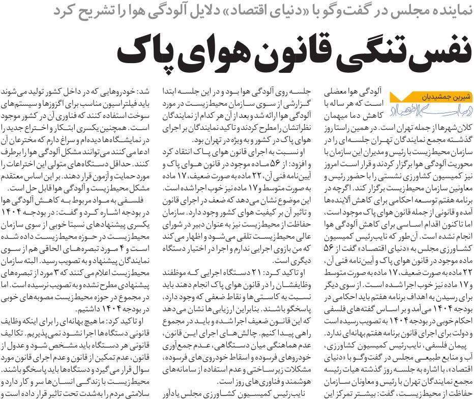 روزنامهٔ دنیای اقتصاد: نفس تنگی قانون هوای پاک