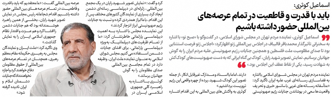 روزنامهٔ صبح نو: اسماعیل کوثری: باید با قدرت و قاطعیت در تمام عرصه‌های بین‌المللی حضور داشته باشیم