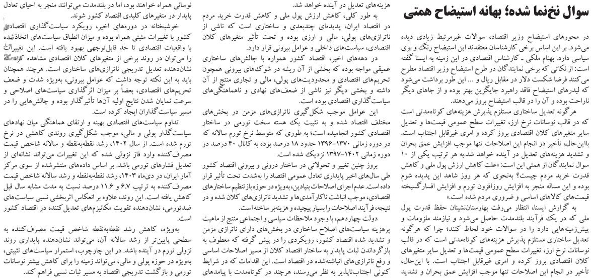 روزنامهٔ ابرار اقتصادی: سوال نخنما شده، بهانه استیضاح همتی