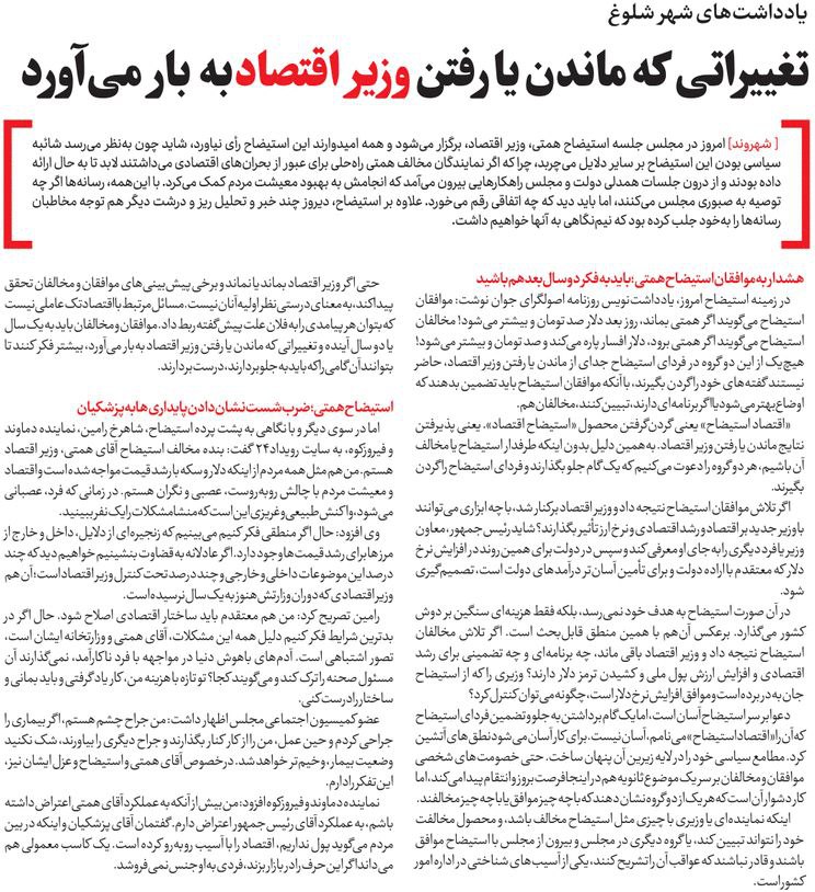 روزنامهٔ شهروند: تغییراتی که ماندن یا رفتن وزیر اقتصاد به بار میآورد