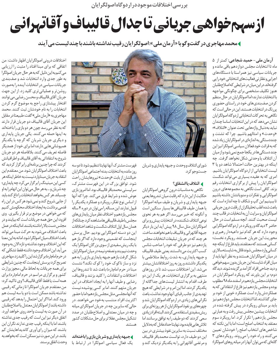 روزنامهٔ آرمان ملی: بررسی اختلافات موجود در اردوگاه اصولگرایان