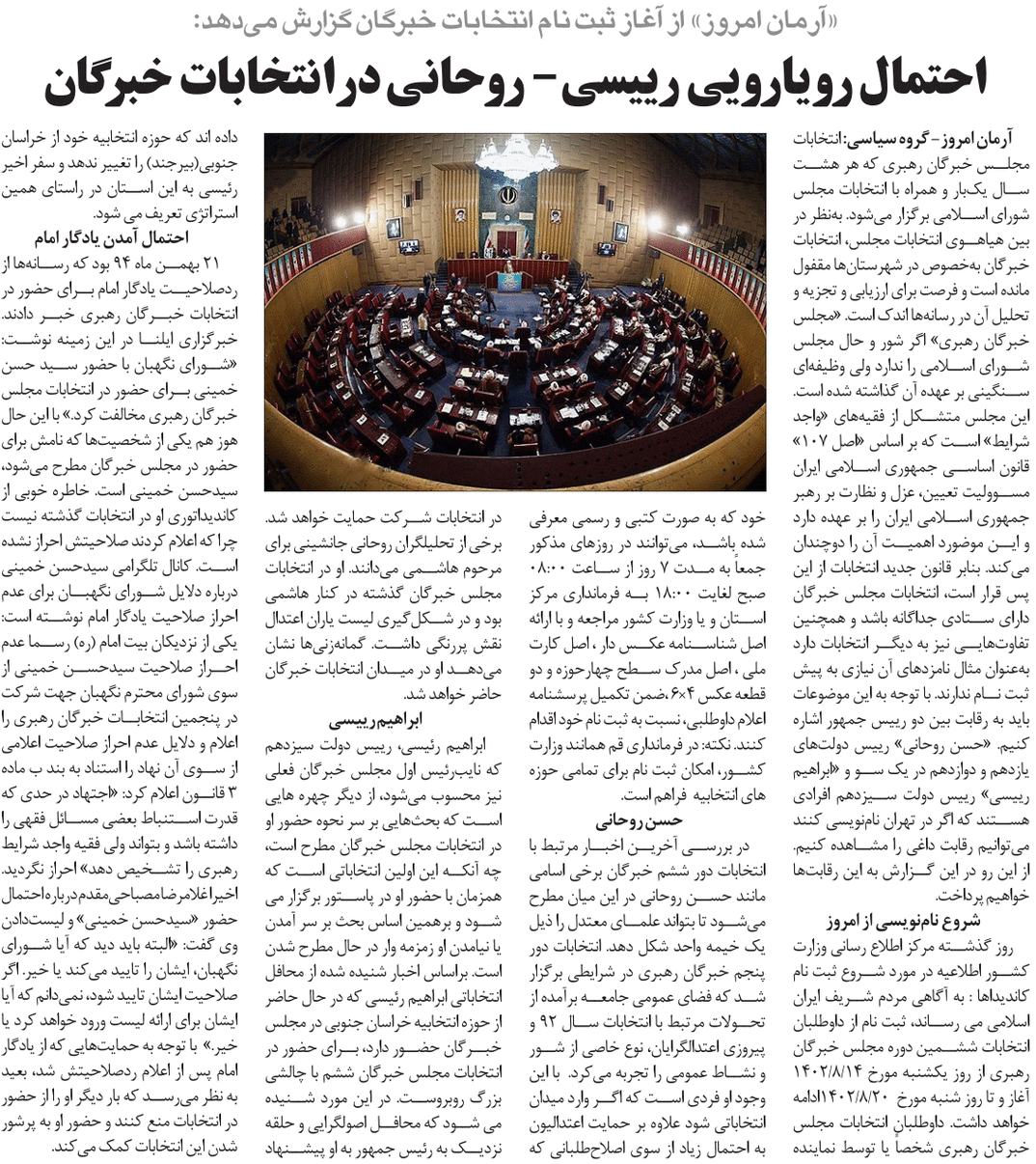 روزنامهٔ آرمان امروز: «آرمانامروز» از آغاز ثبتنام انتخابات خبرگان گزارش میدهد: