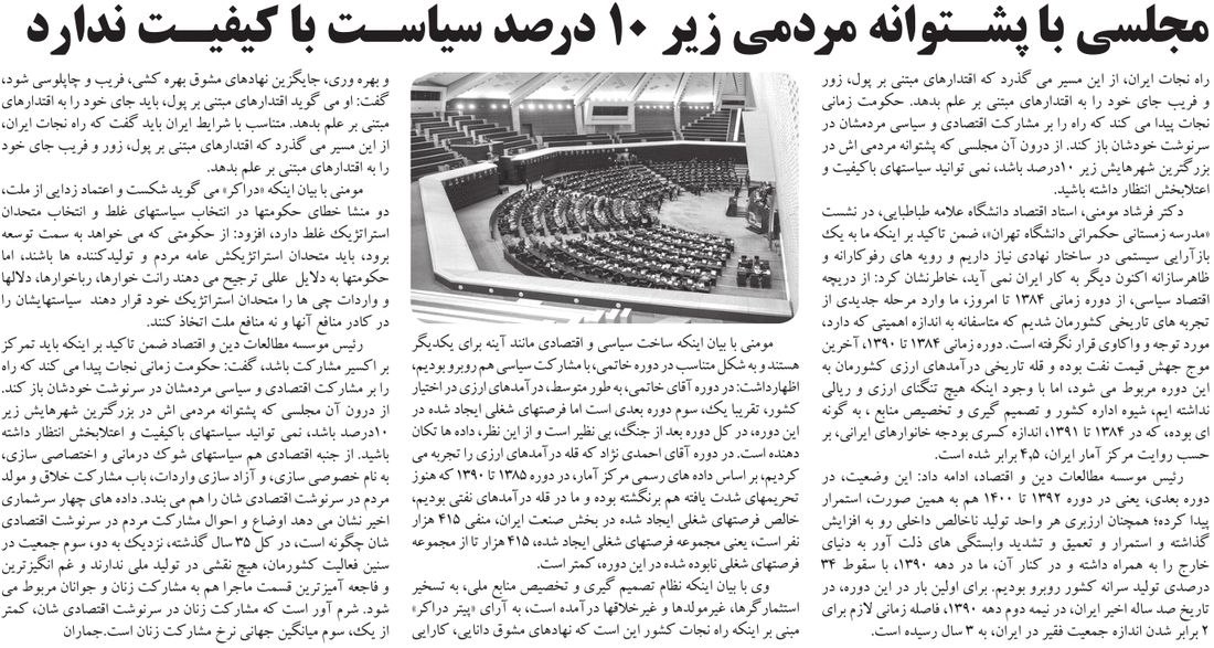 روزنامهٔ ابرار: مجلسی با پشتوانه مردمی زیر ۱۰ درصد سیاست با کیفیت ندارد