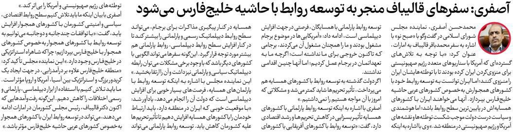 روزنامه صبح نو: آصفری: سفرهای قالیباف منجر به توسعه روابط با حاشیه خلیجفارس میشود