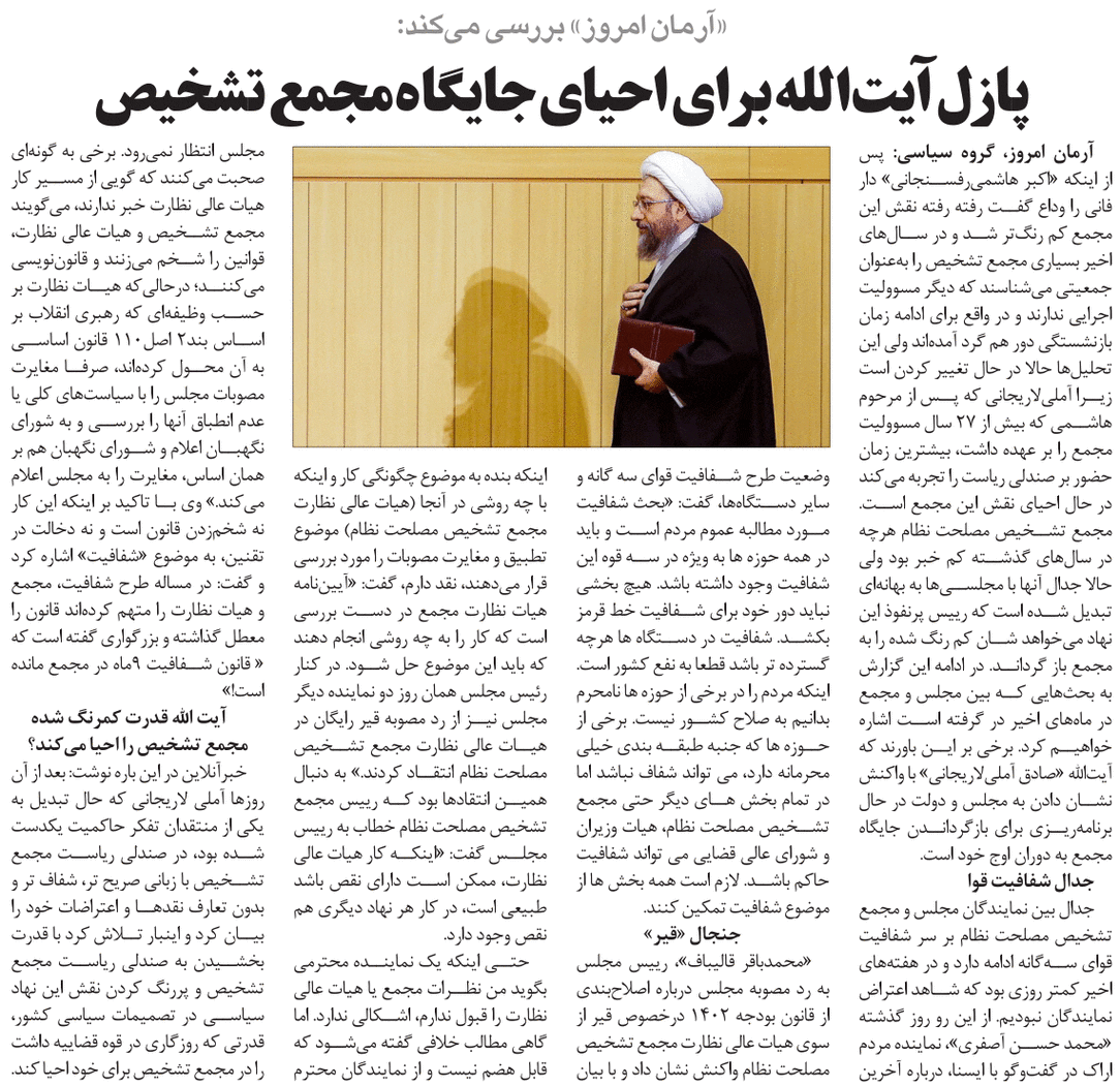 روزنامه آرمان امروز: پازل آیتالله برای احیای جایگاه مجمع تشخیص