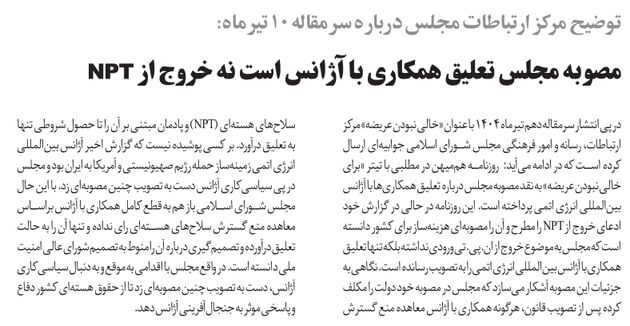 روزنامهٔ هممیهن: مصوبه مجلس تعلیق همکاری با آژانس است نه خروج از NPT