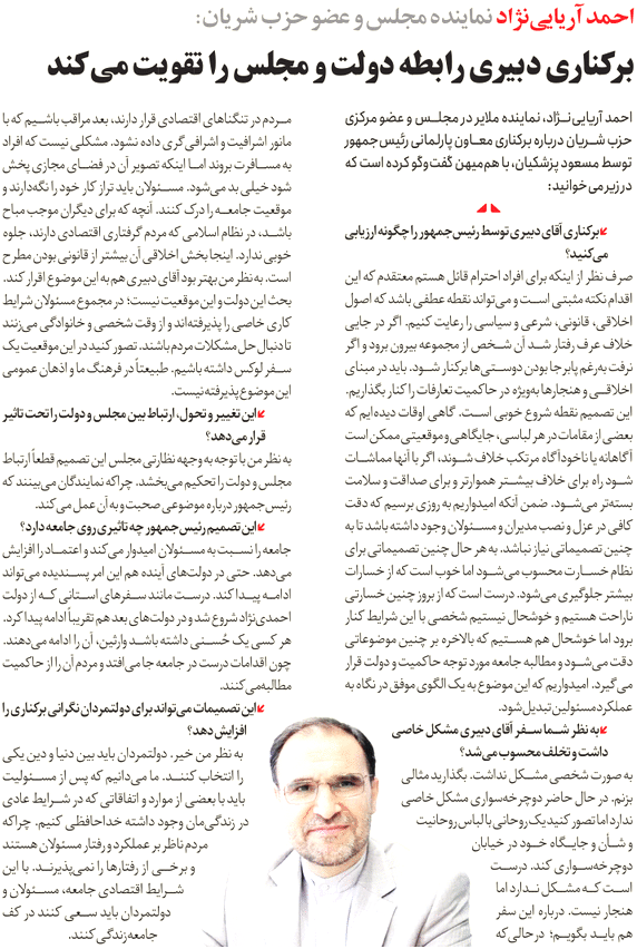 روزنامهٔ هم میهن: برکناری دبیری رابطه دولت و مجلس را تقویت میکند