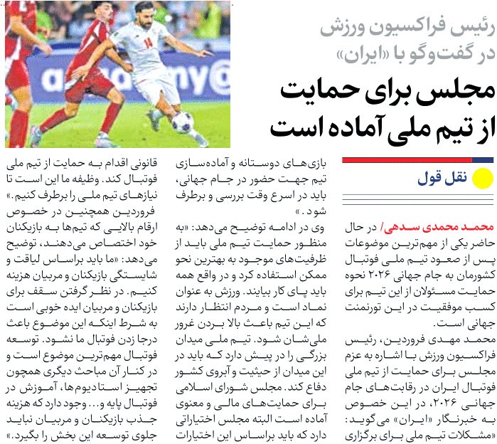 روزنامهٔ ایران: مجلس برای حمایت از تیم ملی آماده است