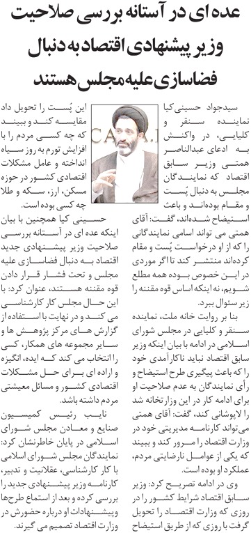 روزنامهٔ روزان: عدهای در آستانه بررسی صلاحیت وزیر پیشنهادی اقتصاد به دنبال فضاسازی علیه مجلس هستند