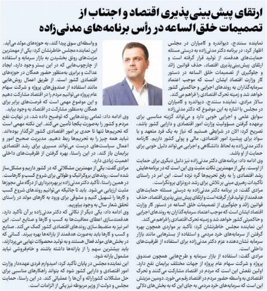 روزنامهٔ ایران: ارتقای پیشبینیپذیری اقتصاد و اجتناب از تصمیمات خلقالساعه در راس برنامههای مدنیزاده