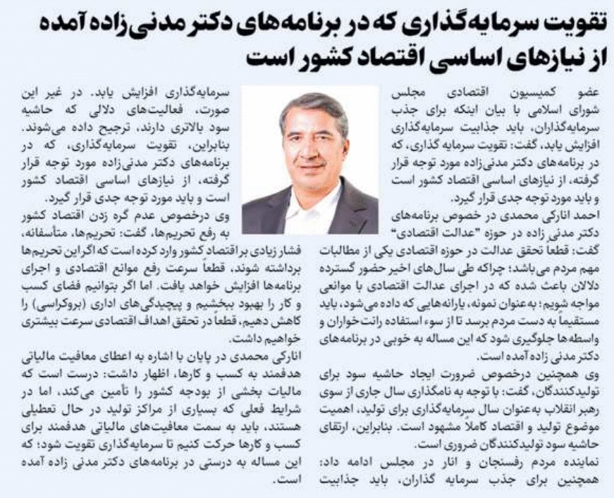 روزنامهٔ ایران: تقویت سرمایهگذاری که در برنامههای دکتر مدنیزاده آمده از نیازهای اساسی اقتصاد کشور است