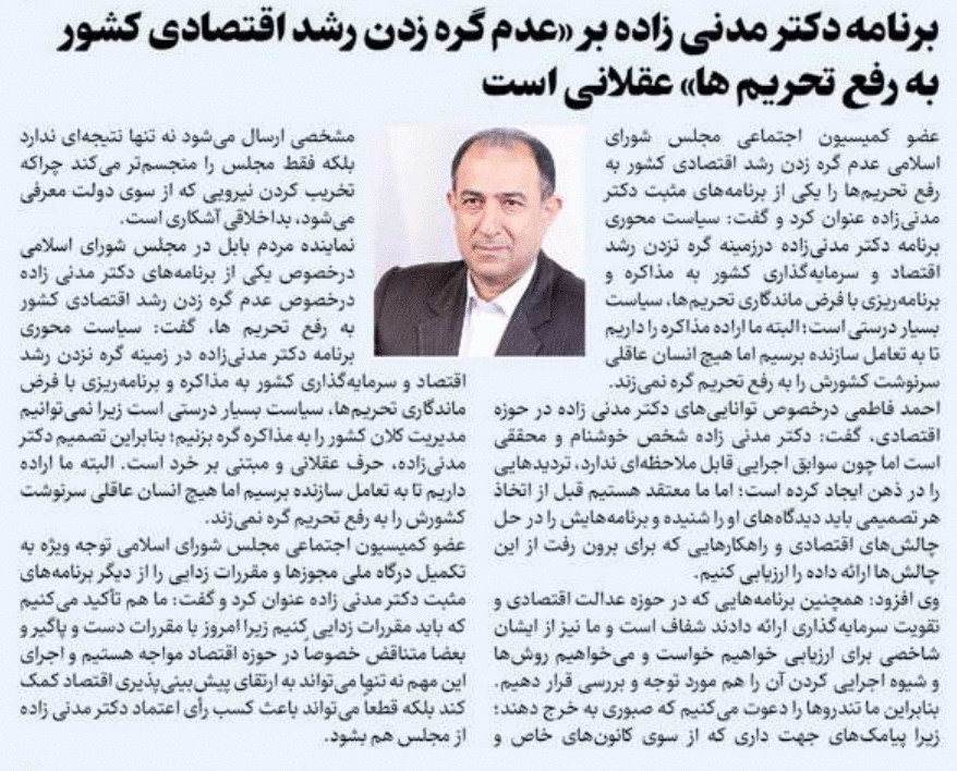 روزنامهٔ ایران: برنامه دکتر مدنیزاده بر «عدم گره زدن رشد اقتصادی کشور به رفع تحریمها» عقلانی است