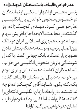 روزنامهٔ دنیای اقتصاد: عذرخواهی قالیباف بابت سخنان کوچک‌زاده