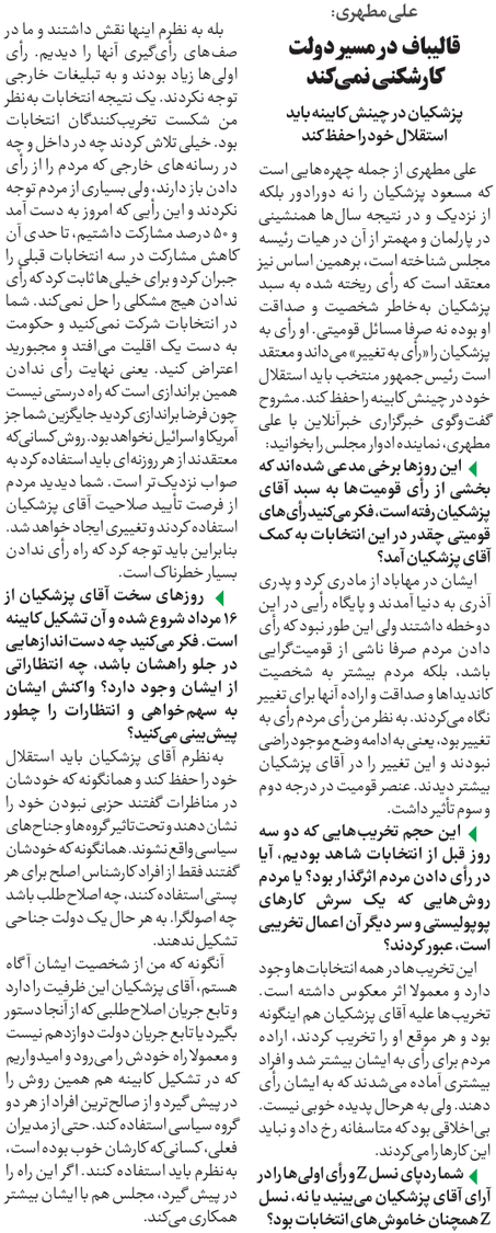 روزنامهٔ آرمان ملی: علی مطهری:قالیباف در مسیر دولت کارشکنی نمیکند