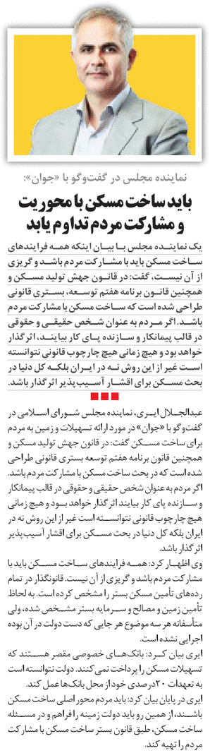 روزنامهٔ جوان: باید ساخت مسکن با محوریت و مشارکت مردم تداوم داشته باشد