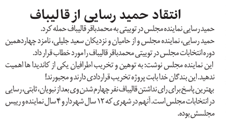 روزنامهٔ ثروت: انتقاد حمید رسایی از قالیباف